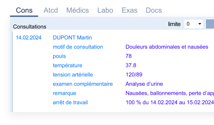 Les informations médicales sont centralisées et stucturées. Profitez des diverses passerelles et raccourcis.